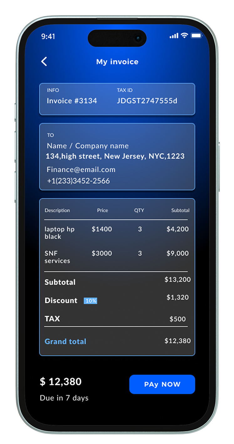 E-invoices in Blue App provide a seamless billing solution for both merchants and freelancers, allowing them to create, send, and manage invoices effortlessly and securely.